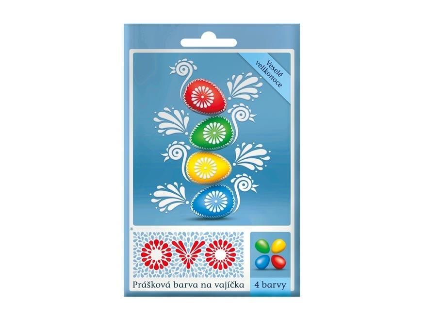 Zestaw 4 szt. farbek w proszku do barwienia jajek. Jedno opakowanie wystarcza do zabarwienia 50-60 jajek. Opakowanie zawiera: 4x farbki w proszku 5g INSTRUKCJA OBSŁUGI: Zawartośc woreczka rozpuścić w 1/3 l gorącej wody (ok. 70 C), z 2-3 łyżkami octu i włożyć czyste, odtłuszczone i ugotowane na twardo jajka na 2-5 minut. Zabarwione jajka wyjąć i pozostawić do wyschnięcia. Dla uzyskania większego nasycenia kolorów użyć mniejszej ilości wody, mieszając poszczególne kolory można uzyskać różne odcienie. Dla uzyskania połysku jajka po barwieniu należy natłuścić. Wymiar: 88mm x 150mm x 5mm (szer. x wys. x gł.)