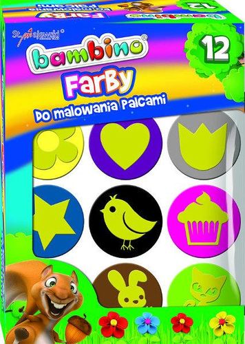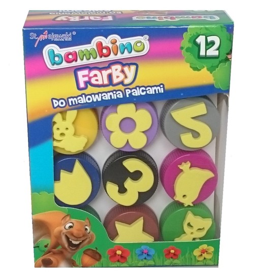 Farby do malowania palcami 12 kolorów. Zakrętki słoiczków z farbami mogą służyć jako pieczątki. Pojemność 12x15 ml.