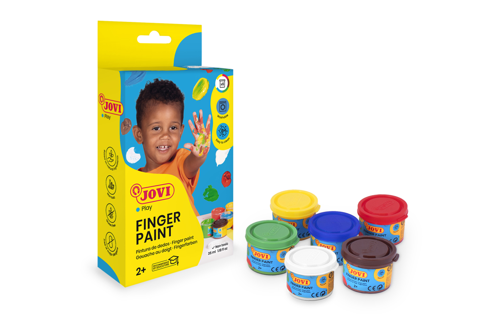 Opakowanie zawiera 6 pojemników po 35ml z farbą do malowania palcami, w podstawowych kolorach.