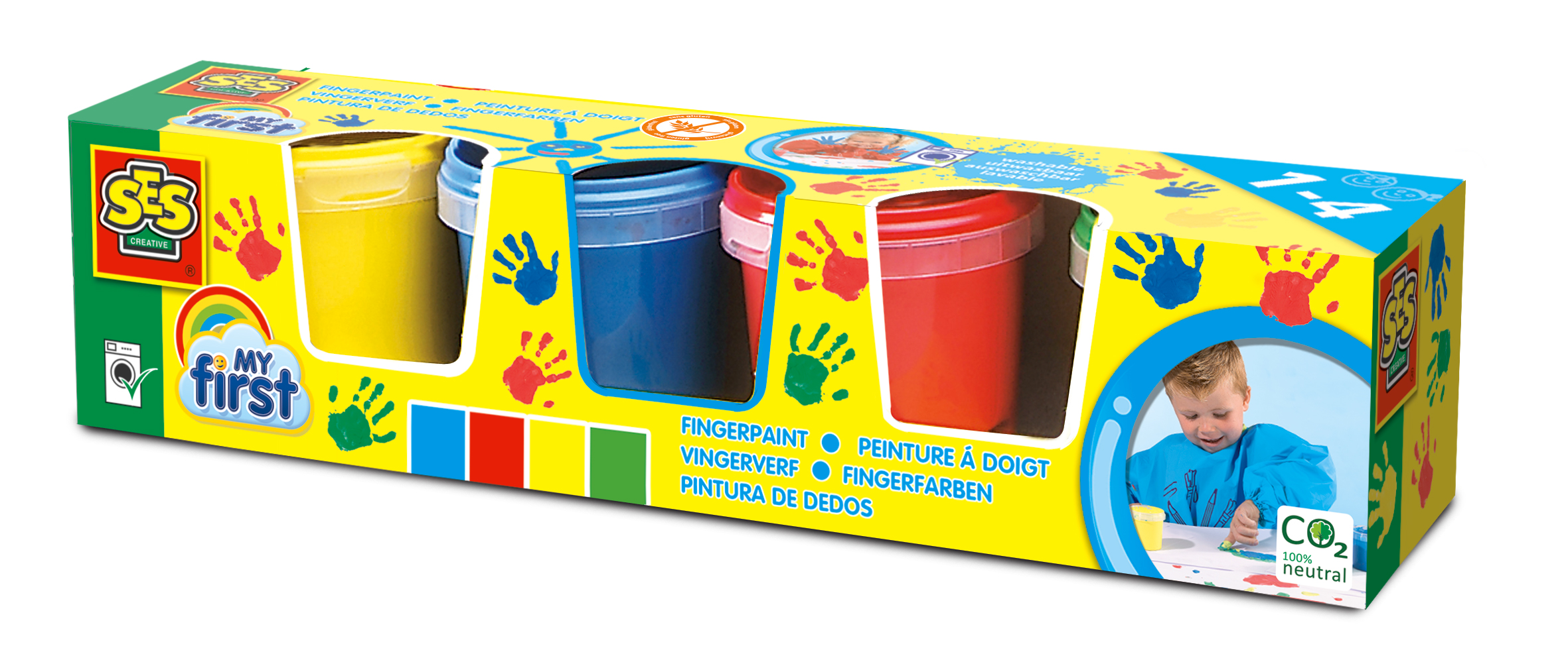 SES Creative stworzył serię moje pierwsze dla najmłodszych dzieci. Zestaw zawiera 4 x 150 ml farbek w kolorach: czerwony, żółty, zielony, niebieski. Doskonała zabawa gwarantowana. Ileż można malować pędzelkiem - zróbmy to paluszkami, będzie dużo śmieszniej. Farby doskonale się zmywają, jest nam do tego potrzebna tylko woda, mydło i gąbka.