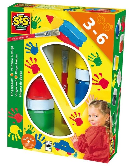 Doskonała zabawa nawet dla najmłodszych dzieci. Ileż można malować pędzelkiem - zróbmy to paluszkami, będzie dużo śmieszniej. Farby doskonale się zmywają, jest nam do tego potrzebna tylko woda, mydło i gąbka. Zestaw zawiera pędzelek oraz 6 x 45 ml farbek w kolorach: biały, żółty, czerwony, zielony, niebieski, czarny. Dla dzieci od 3 roku życia. Wyprodukowano w Holandii
