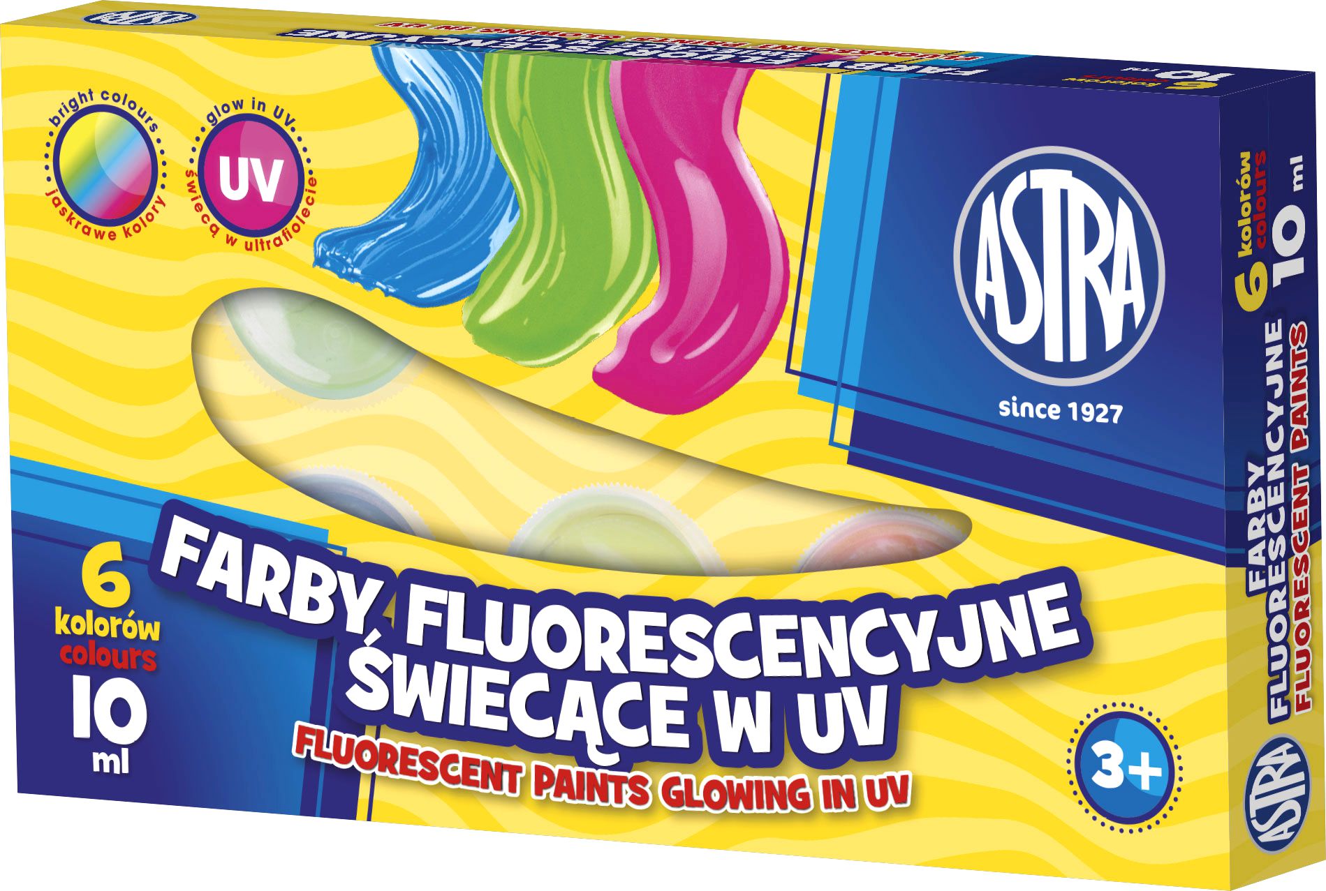 Oprócz tradycyjnej gamy barw farb plakatowych w ofercie Astry znajdują się także farby fluorescencyjne. Pozwalają one użytkownikowi wyjść poza tradycyjną skalę barw. Farby fluorescencyjne świecą w świetle UV. Doskonałe do celów dekoracyjnych oraz do wykańczania prac plastycznych.