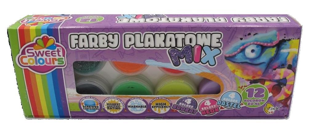 Farby plakatowe 12 kolorów: 4 neon, 4 pastel, 4 brokat.