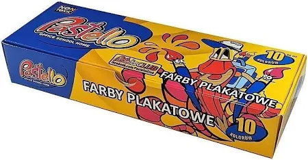 Farby plakatowe 10 kolorów. Pojemność 20 ml. Farby na bazie wody o intensywnych kolorach. Znakomitą przyczepność pozwala na malowanie takich podłoży jak: papier, karton, drewno, ceramika, kamień. Wymalowane powierzchnie po wyschnięciu są matowe o intensywnych barwach, odporne na działanie światła i ścieranie. Wyprodukowane w Polsce.