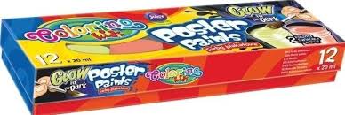 Farby plakatowe 12 kolorów w słoiczkach 20 ml. W zestawie dwa kolory świecące w nocy.