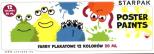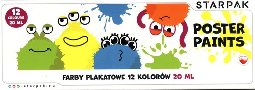 Farby plakatowe STARPAK są dostępne w zestawach po 12 kolorów. Każdy kolor w zamykanym pojemniczku o pojemności 20 ml. Można je bardzo długo przechowywać. A co jeśli po kilku latach wyschną? Żaden problem. Wystarczy dodać trochę wody i farby odzyskają swoją pierwotną konsystencje.