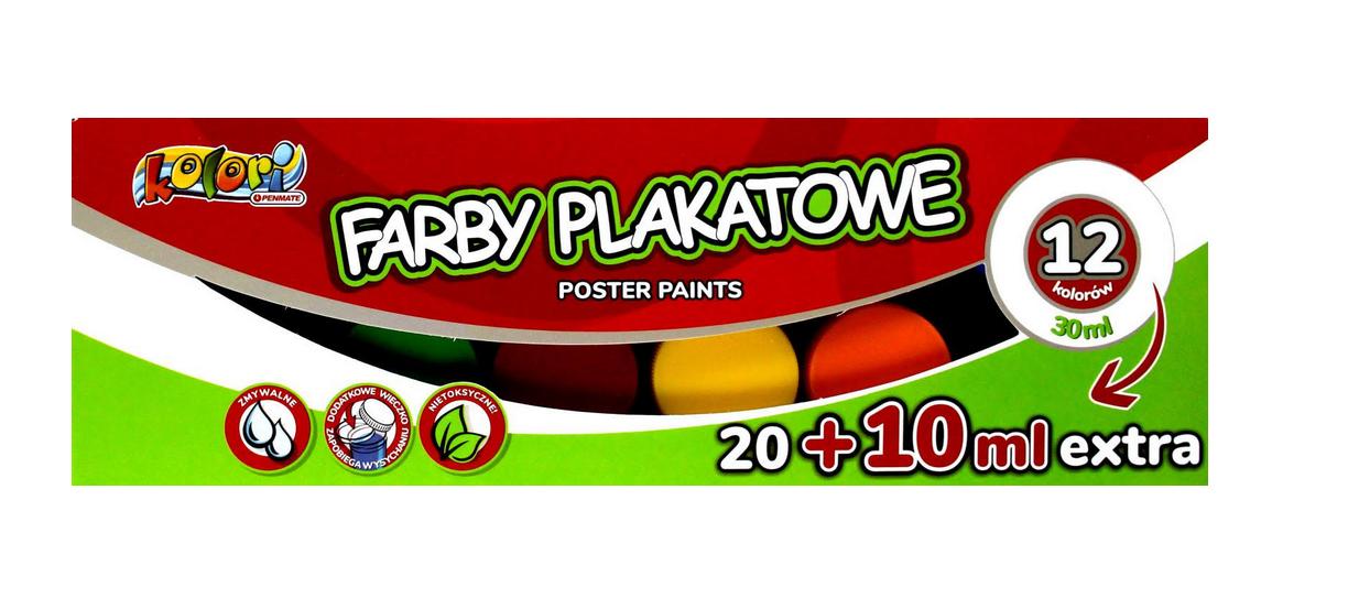 Farby plakatowe o intensywnych barwach i dobrych własnościach kryjących. Pojemność 30 ml., pojemniki na farbę zabezpieczone wewnętrznym dekielkiem. Nietoksyczne, zgodne z normą EN71. Do produkcji użyto bezpiecznych składników niepowodujących uczuleń i trwałych zabrudzeń.