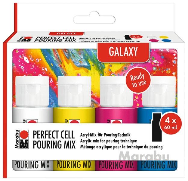 Zestaw do techniki Pouring Marabu Super Cell Pouring Set. Zestaw Super Cell Pouring umożliwia tworzenie wyjątkowych efektów bez potrzeby dodatkowego mieszania mediów czy użycia oleju silikonowego. Farby są już idealnie dobrane i mają optymalną płynność, dzięki czemu są gotowe do użycia bezpośrednio po otwarciu. Produkt nadaje się do wszystkich popularnych technik pouringowych. Uwaga: Farba może się lekko osadzać, dlatego przed użyciem dobrze wstrząśnij lub dokładnie wymieszaj. Zawartość zestawu 4 x 60 ml Pouring Mix: tytanowa biel, żółty, różowy, niebieski. Z pomocą tego zestawu stworzysz pouringowy obraz o minimalnym rozmiarze około 30 x 40 cm, w zależności od użytej techniki i powierzchni. Super Cell Pouring Set to idealny wybór dla wszystkich, którzy chcą szybko osiągnąć efektowne rezultaty bez konieczności czasochłonnego przygotowywania i mieszania składników.