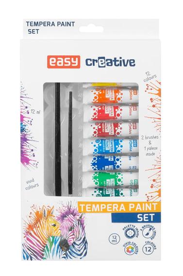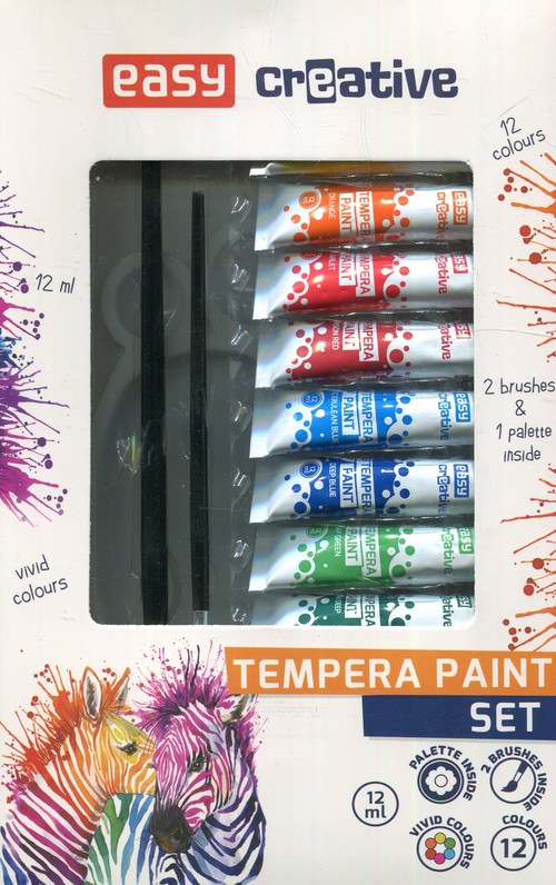 Farby są dostarczane w poręcznych aluminiowych tubkach, wystarczy wycisnąć odpowiednią ilość na tackę i rozpocząć malować. Bardziej doświadczeni twórcy w celu uzyskania dodatkowych odcieni i efektów mogą dowolnie mieszać kolory na dołączonej do zestawu palecie . W zestawie: farby tempera (12 tubek), 2 pędzelki, tacka do mieszania kolorów.