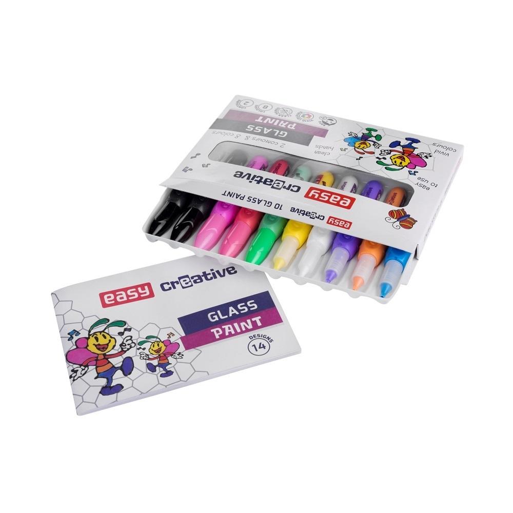 Zestaw farb witrażowych w żywych kolorach z gotowymi szablonami do pomalowania. Zestaw zawiera: - 10 kolorów farb w tym 2 czarne do wykonania konturów 10,5ml każda - książeczka z szablonami - folia