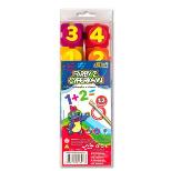 Farby mogą być stosowane bez użycia wody, idealnie rozporwadzają się na papierze, kartonie czy brystolu. 12 super kolorów do wyboru, w dużych 20 ml słoiczkach. Każdy pojemniczek posiada wieczko z innym stempelkiem. Dodatkowo w opakowaniu znajduje się wysokiej jakości drewniany pędzelek. Słoiczki składają się w kolorowe puzzle. Zestaw z cyferkami umożliwia naukę działań matematycznych przez zabawę. Nietoksyczne, zgodne z EN7 1-3.