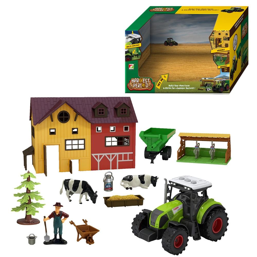 Zestaw zawiera: traktor z dźwiękami i światłem, przyczepę, budynek gospodarczy, miejsce dla krów, krowy, jedzenie dla krów, kankę na mleko, drzewo, gospodarza z łopatą, wiadrem i taczką. Wymagane baterie - 3 x AG13 (dołączone). Wymiary opakowania: 42,5 x 30,5 x 26 cm.