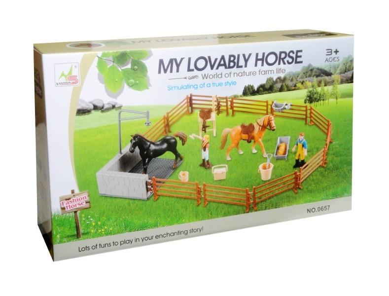 Zestaw do zabawy stajnia. W zestawie znajduje się m.in miejsce wybiegu dla konia, prysznic, 2 figurki koni, 2 figurki opiekunów, wiadro, paśnik, ogrodzenie, miejsce na umieszczenie siodła. Zabawka dla dzieci od 3 lat. Podane wymiary są wymiarami opakowania. Zabawka zapakowana w kartonowe opakowanie.