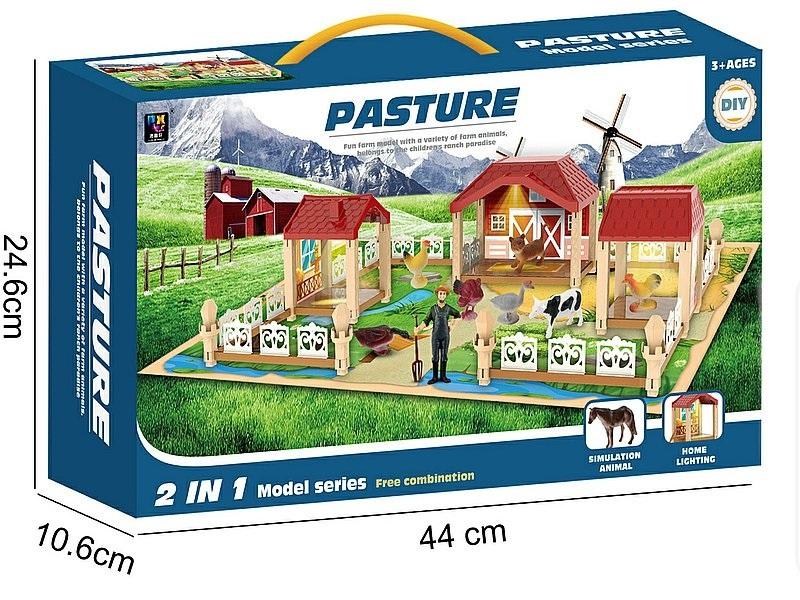 zestaw farma, budynek ze światłem, zwierzęta; 44x25x11cm, Box