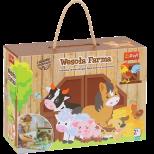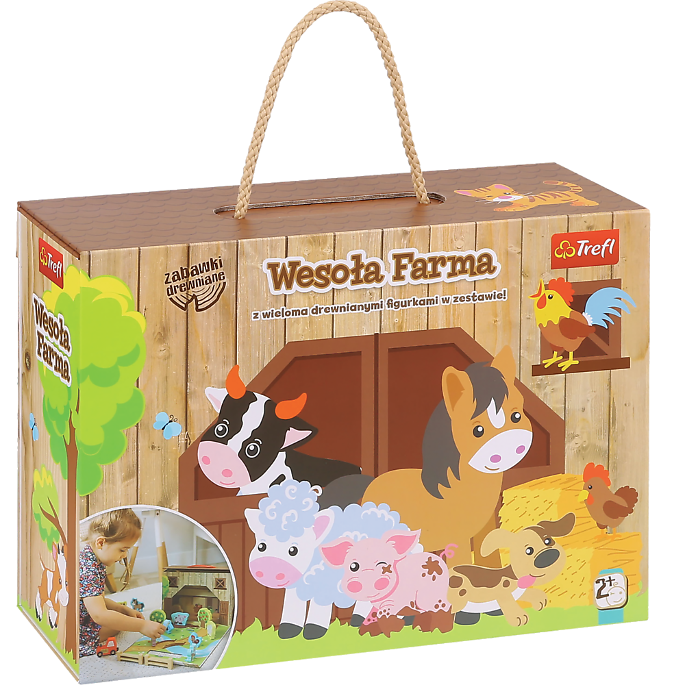 Wesoła farma to zestaw drewnianych figurek wraz z tekturową scenerią farmy z elementami magnetycznymi, która stanowi zarówno opakowanie, jak i element zabawki.
