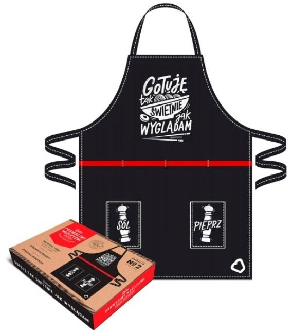 Fartuch z zabawnym nadrukiem zapakowany w eleganckie pudełko.
