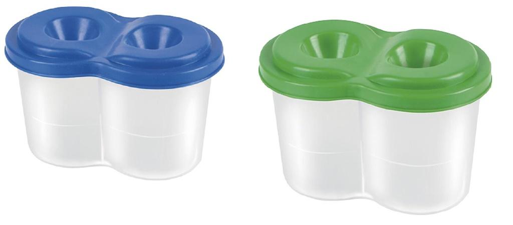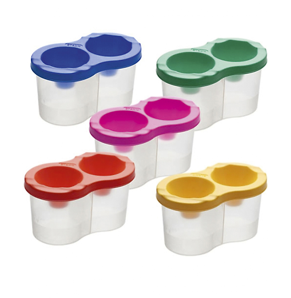 - kubeczek zapobiega wylewaniu się wody - przykrywka posiada specjalne miejsce na wygodne odłożenie pędzelka - duży kubeczek z dwoma otworkami umożliwiający odłożenie naraz dwóch pędzelków - dwa oddzielne pojemniki na wodę po jasnych i ciemnych farbach, lub dla dwójki dzieci siedzących w jednej ławce - dostępne kolory: niebieski, zielony, czerwony, żółty