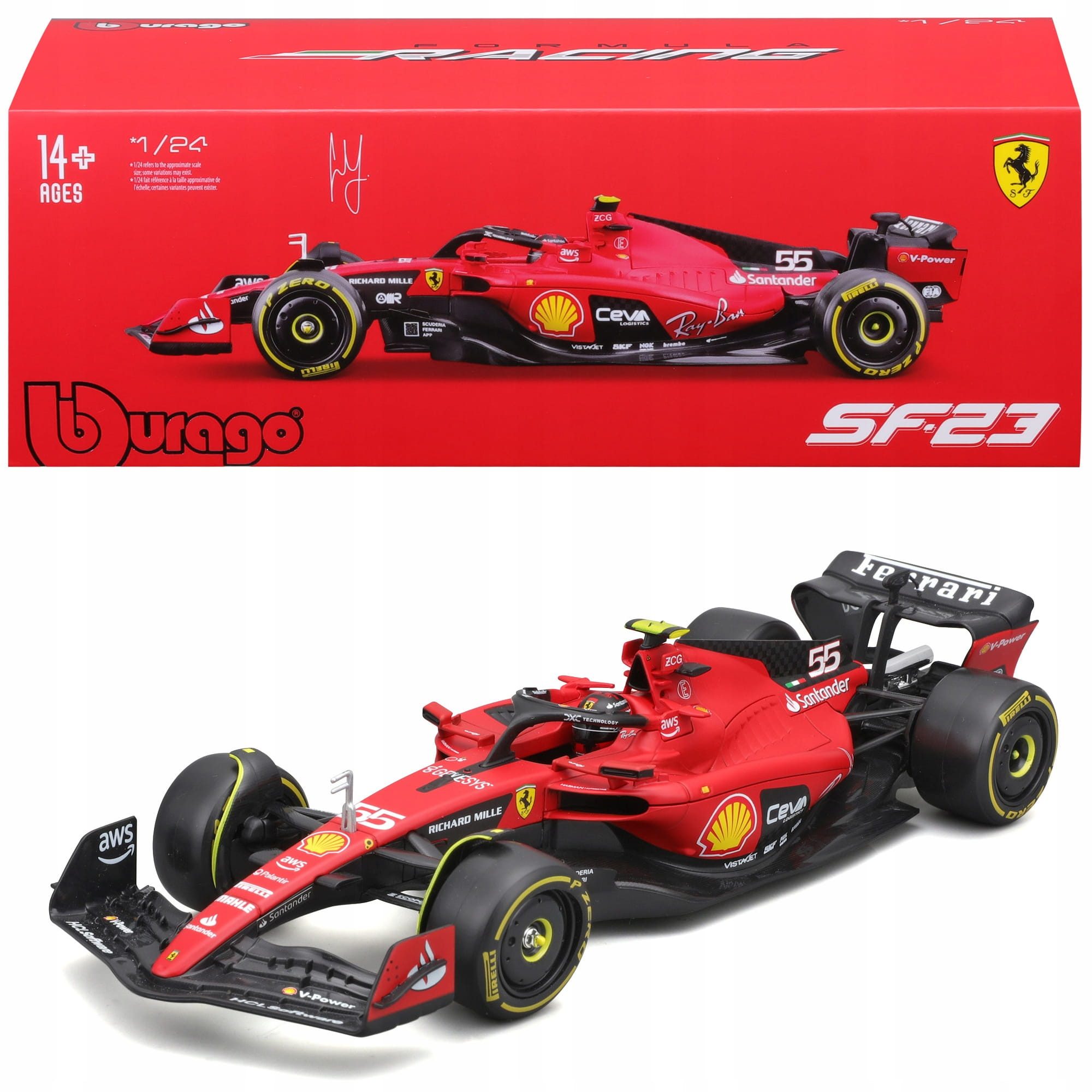 Bburago zaprasza Cię do przeżycia dreszczu prędkości dzięki precyzyjnie zaprojektowanemu 2023 SFR Ferrari SF-23 F1, prezentującemu talenty Sainza #55 w pieczołowicie wykonanej, odlewanej replice w skali 1:24. Model ten może pochwalić się całkowicie odlewaną metalową obudową ozdobioną autentyczną grafiką z dnia wyścigu, oddającą istotę wyścigów Formuły 1. Drobno szczegółowe przednie i tylne błotniki z efektami naziemnymi w połączeniu z pełnymi logo sponsorów podkreślają aerodynamiczną doskonałość tej dynamicznej maszyny wyścigowej. Gładko toczące się gumowe opony wyścigowe dodają odrobiny realizmu, a niestandardowa akrylowa gablota stanowi odpowiednią scenę dla tego wyjątkowego egzemplarza. Dla kolekcjonerów, którzy rozkoszują się emocjami związanymi z Formułą 1, ta replika ucieleśnia prędkość, precyzję i innowacyjność będące synonimami wyścigowego dziedzictwa Ferrari.