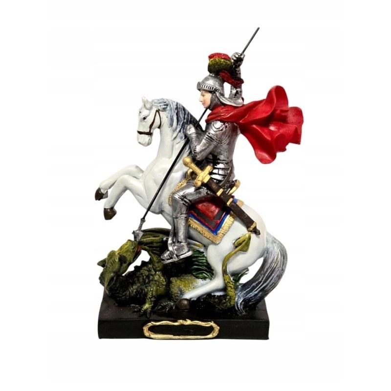 Odkryj potęgę i symbolikę figury św. Jerzego, która przedstawia triumf dobra nad złem. Święty Jerzy, odważny rycerz, siedzi na koniu i z determinacją zabija smoka, symbolizującego zło. Wykonana z wysokiej jakości żywicy syntetycznej, ta 23-centymetrowa figura jest nie tylko piękną ozdobą, ale także inspirującym symbolem odwagi i wiary. Idealna do domowego ołtarzyka, jako prezent lub element dekoracyjny.