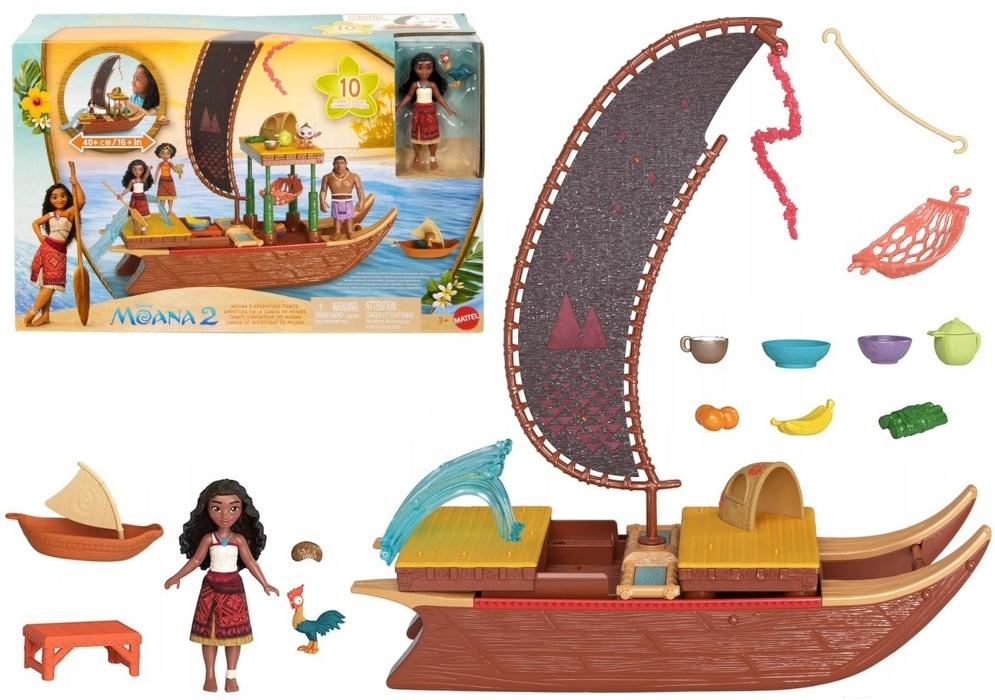 W zestawie znajduje się figurka Vaiany, która doskonale pasuje do łodzi i pozwala odgrywać sceny znane z filmu lub tworzyć własne historie. Całość uzupełniają liczne akcesoria takie jak naczynia, owoce, mała łódka, zwierzątko oraz elementy wyposażenia pokładu, które wzbogacają zabawę i zwiększają jej realizm.