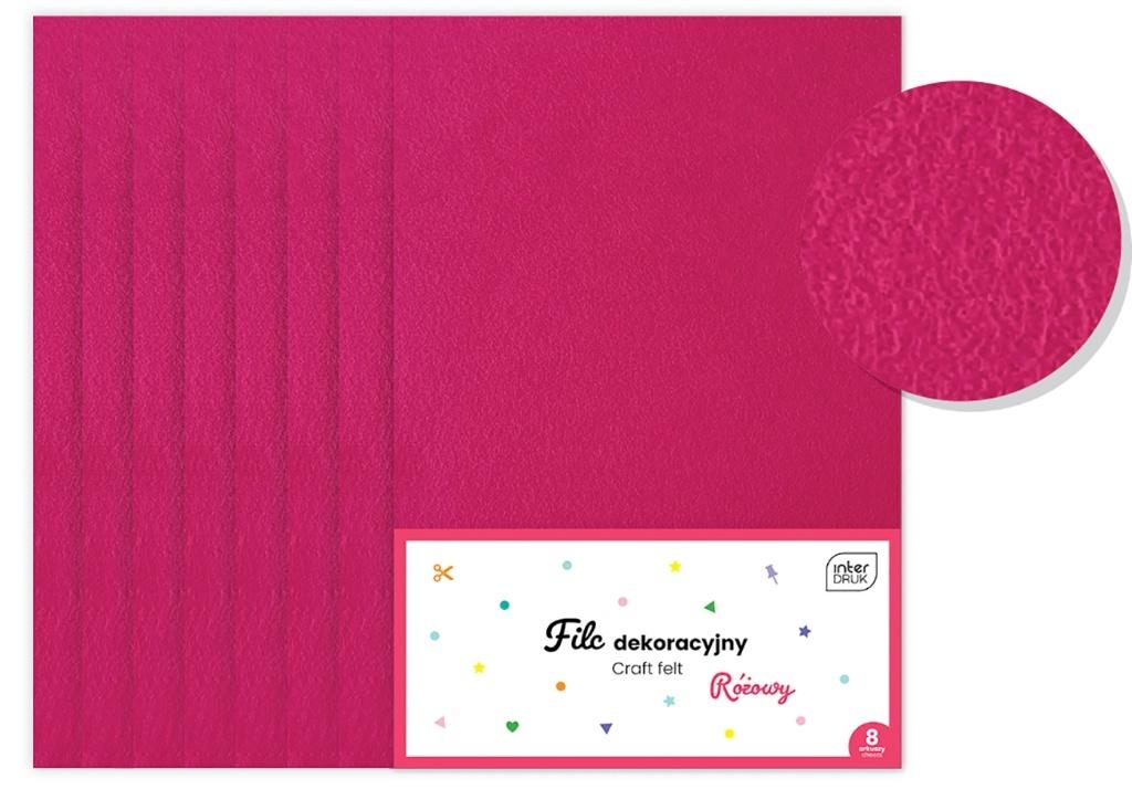 • Opakowanie zawiera 8 arkuszy filców w rozmiarze A4 w różowym kolorze.