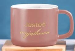 Customizacja: biała baza filiżanki + kolor na zewnątrz, złoty napis z jednej strony filiżanki