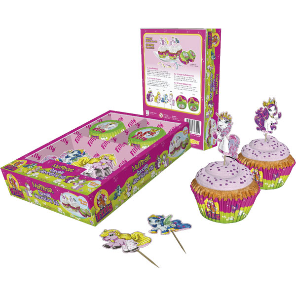 Z 48 cz. zestawem na muffiny Filly wyczarujecie Państwo perfekcyjne muffiny. Jest to fantastyczna i błyskawiczna dekoracja muffinów! A przy tym mnóstwo dobrej zabawy i satysfakcji! Muffiny w fantastycznych papilotkach, z gwiazdorskimi pickerami... Hit przyjęcia gotowy!