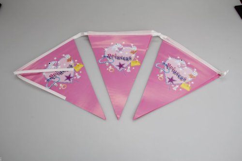 FLAGI OZDOBNE RÓŻOWE Z MOTYWEM KRÓLEWNY. 10 SZT POŁĄCZONE TASIEMKĄ. DŁUGOŚĆ 2,5-3 M. FLAGI W KSZTAŁCIE TRÓJKĄTA O WYMIARACH 21x31x31 CM. NAJKRÓTSZY BOK PRZYMOCOWANY DO SZNURKA.
