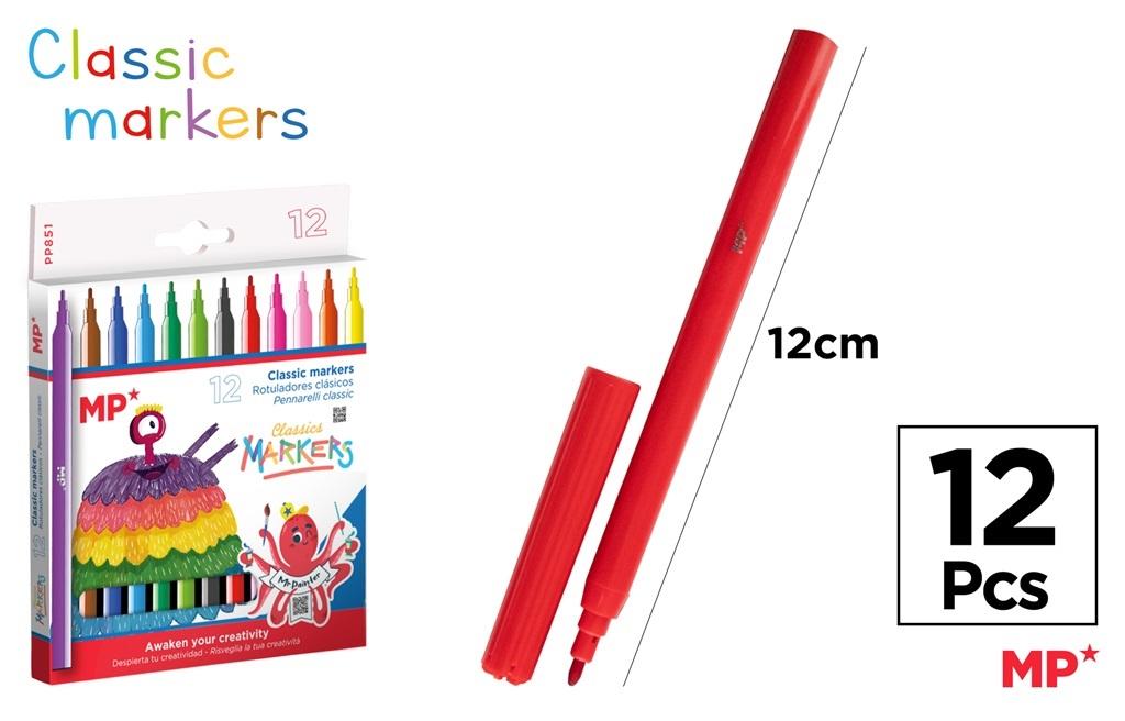 Kolorowe markery. Tusz na bazie wody. Bardzo żywe i trwałe kolory, które pobudzą dziecięcą kreatywność. Są bardzo łatwe w czyszczeniu, zarówno z rąk, jak i z większości tkanin. Średnia,stała końcówka o dużej odporności na nacisk. Pudełko 12 kolorów.