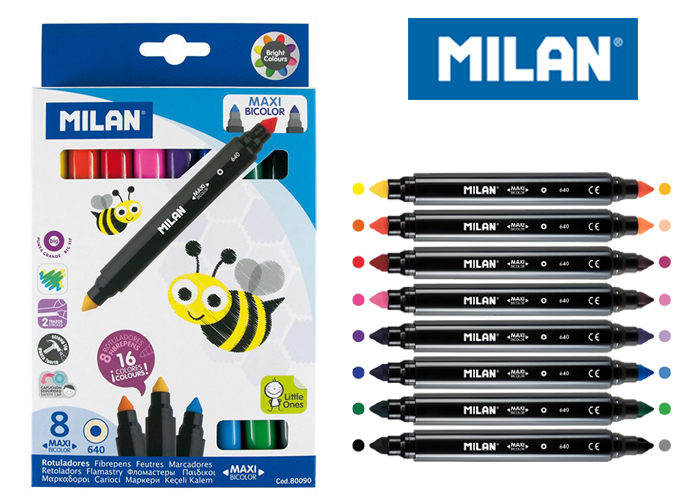 Flamastry grube MAXI 2-stronne (bicolor) z wytrzymałą i elastyczną stożkową końcówką o średnicy 8 mm, która nie wpada do środka nawet przy silnym nacisku. Po chwilowym odkształceniu końcówka zawsze wraca do pierwotnego kształtu. Każdy flamaster posiada końcówki w 2 różnych kolorach, przez co z opakowania zawierającego 8 flamastrów otrzymujemy 16 kolorów. Flamastry pozwalają na rysowanie cienkich i grubych linii (od 3 mm do 0,75 cm). Tusz na bazie wody. Żywe, intensywne kolory. Wentylowana skuwka. Flamastry MILAN są zgodne z europejskimi i amerykańskimi normami bezpieczeństwa. Nie zawierają ftalanów, metali ciężkich i innych substancji toksycznych. Są bezpieczne dla dzieci.