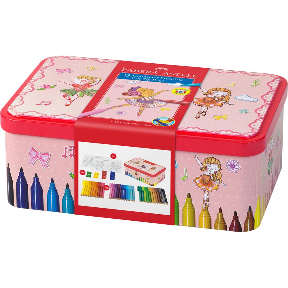 Flamastry Connector 33 kolory w metalowej szkatułce upominkowej Ballerina. Dzięki specjalnym klipsom pisaki można ze sobą łączyć w kreatywne konstrukcje, w opakowaniu klipsy łączące. Tusz na bazie wody, mocna i gruba końcówka pisząca, intensywne kolory. Odpowiednie do malowania większych powierzchni, spieralne z większości tkanin. Metalowe, ozdobne opakowanie w formie szkatułki z naklejkami w prezencie.