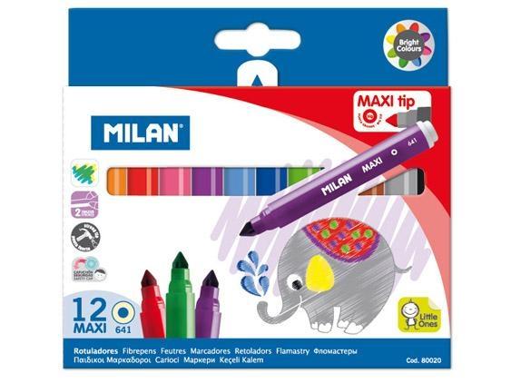 Flamastry grube MAXI z wytrzymałą i elastyczną stożkową końcówką o średnicy 8 mm, która nie wpada do środka nawet przy silnym nacisku. Po chwilowym odkształceniu końcówka zawsze wraca do pierwotnego kształtu. Pozwala na rysowanie cienkich i grubych linii (od 1 mm do 3,25 cm). Tusz na bazie wody. Żywe, intensywne kolory. Wentylowana skuwka. Flamastry MILAN są zgodne z europejskimi i amerykańskimi normami bezpieczeństwa. Nie zawierają ftalanów, metali ciężkich i innych substancji toksycznych. Są bezpieczne dla dzieci.