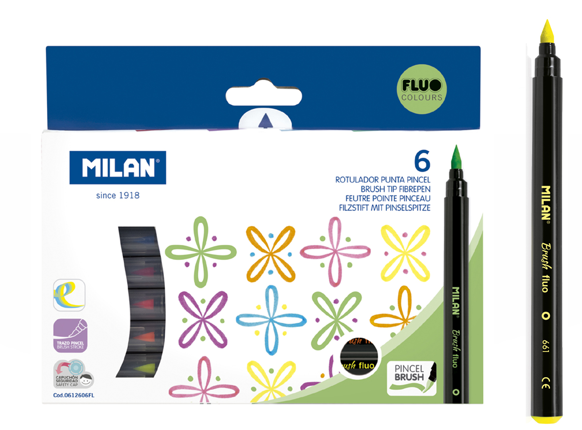 Flamastry z wytrzymałą, elastyczną, nylonową końcówką w kształcie pędzelka. Idealne do kaligrafii, liternictwa i malowania zróżnicowanych kresek oraz mieszania kolorów. Pędzelkowa końcówka pozwala na rysowanie cienkich i grubych linii od 0,5 mm do 6 mm. W opakowaniu 6 FLUO kolorów: żółty, pomarańczowy, różowy, fioletowy, niebieski, zielony. Tusz na bazie wody tworzy jaskrawe i intensywne kolory, które można ze sobą mieszać. Tusz można łatwo wyprać z większości tkanin (moczyć tkaninę w zimnej wodzie przez godzinę, a następnie prać w pralce w niskiej temperaturze). Bezpieczna perforowana skuwka, przezroczysta. Flamastry MILAN są zgodne z europejskimi (EN 71/III) i amerykańskimi ASTM D4236) normami bezpieczeństwa. Nie zawierają ftalanów, metali ciężkich i innych substancji toksycznych. Są bezpieczne dla dzieci. Rozmiar flamastra: 15,6 x ? 1 cm. Rozmiar opakowania: 19 x 12 x 1 cm.