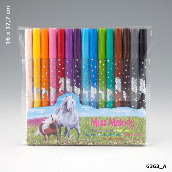 Zestaw flamastrów Miss Melody z wizerunkiem koników w plastikowym etui, 15 kolorów.