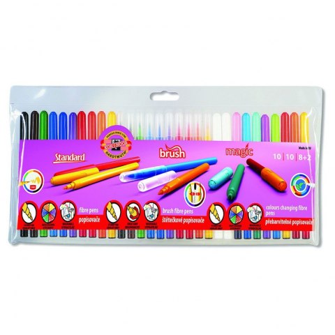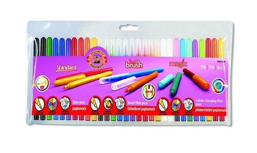 Zestaw flamastrów zawiera 10 kolorów flamastrów szkolnych, 8+2 kolorów flamastrów magic i 10 flamastrów pędzelkowych. Posiadają tusz na bazie wody, nie przesiąkają przez papier.