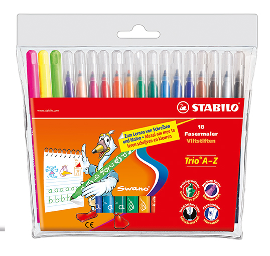 Podstawowe zalety flamastrów STABILO Trio to: trójkątny przekrój, który ułatwia trzymanie, intensywne kolory odporne na działanie światła oraz nietoksyczny tusz bezpieczny dla dzieci powyżej 3 roku życia. Zestaw 18 szt. w praktycznym plastikowym etui z zawieszką.