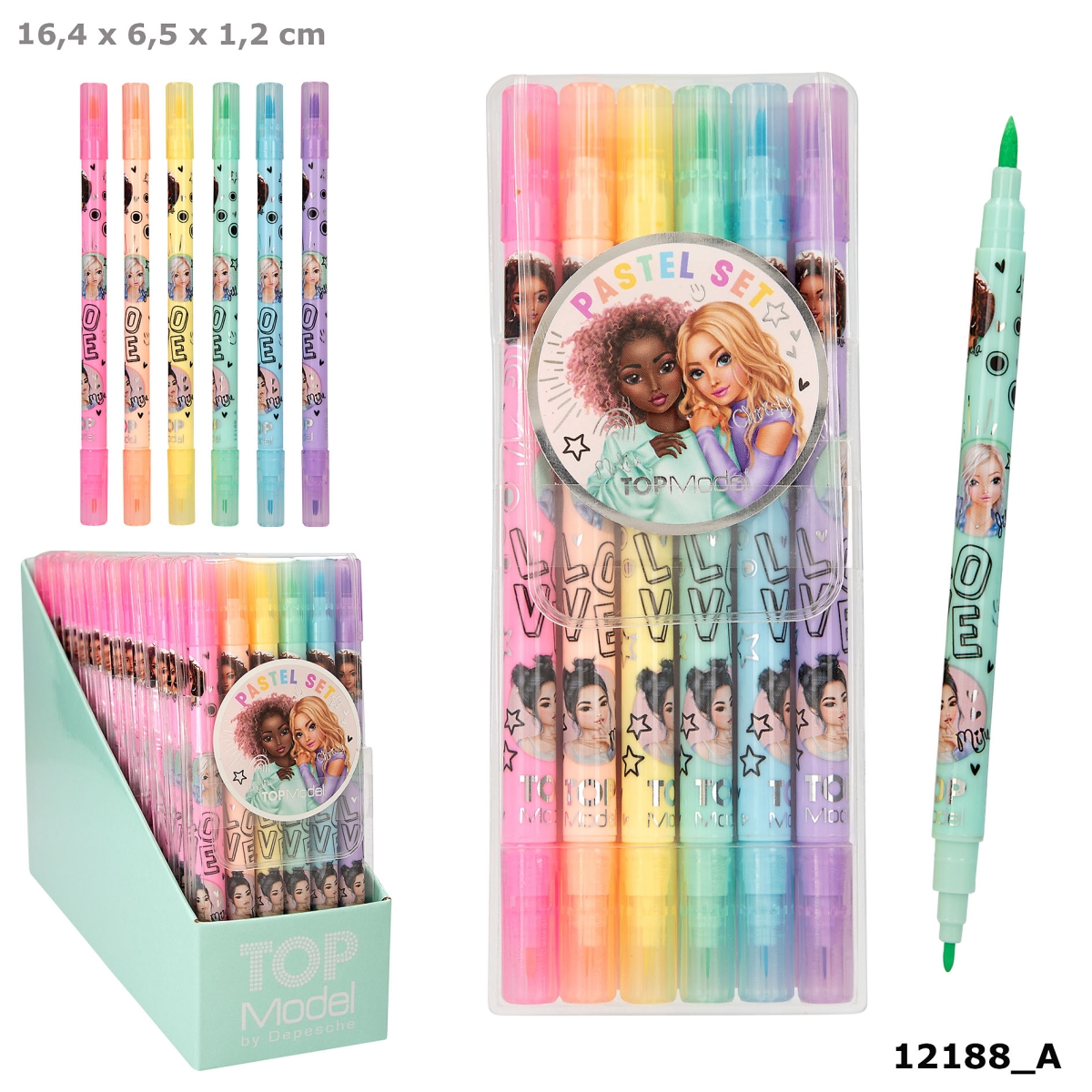 Zestaw 2w1 flamastry z cienkopisami Top Model 6 kolorów. Zestaw dwustronnych flamastrów z cienkopisami Top Model. 6 pastelowych kolorów w plastikowym etui.