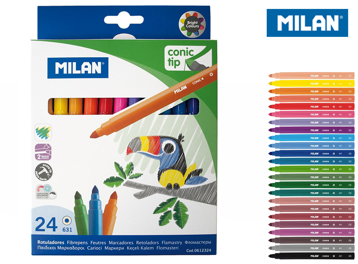 Flamastry z wytrzymałą i elastyczną stożkową końcówką o średnicy 5 mm, która nie wpada do środka nawet przy silnym nacisku. Po chwilowym odkształceniu końcówka zawsze wraca do pierwotnego kształtu. Pozwala na rysowanie cienkich i grubych linii (od 3 mm do 0,75 cm). Tusz na bazie wody. Żywe, intensywne kolory. Wentylowana skuwka. Flamastry MILAN są zgodne z europejskimi i amerykańskimi normami bezpieczeństwa. Nie zawierają ftalanów, metali ciężkich i innych substancji toksycznych. Są bezpieczne dla dzieci.
