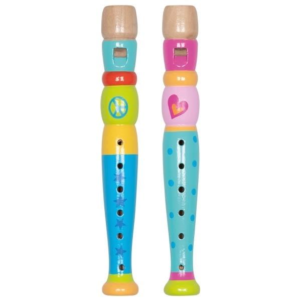 Drewniany kolorowy flet. Pozwala opanować podstawy gry na instrumencie dętym, rozwijając słuch muzyczny, kontrolę oddechu oraz koncentrację podczas nauki melodii.