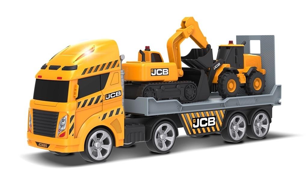 Zmień pokój dziecka w plac budowy! Ten 3-elementowy zestaw składa się z pojazdów wzorowanych na dużych maszynach budowlanych. Duża laweta posiada światełka i wydaje realistyczne odgłosy, wyposażona jest także w opuszczany najazd dla dwóch mniejszych pojazdów: koparki i ładowarki. Swobodny ruch kół ułatwia przesuwanie pojazdów, czyniąc zabawę jeszcze bardziej ekscytującą.