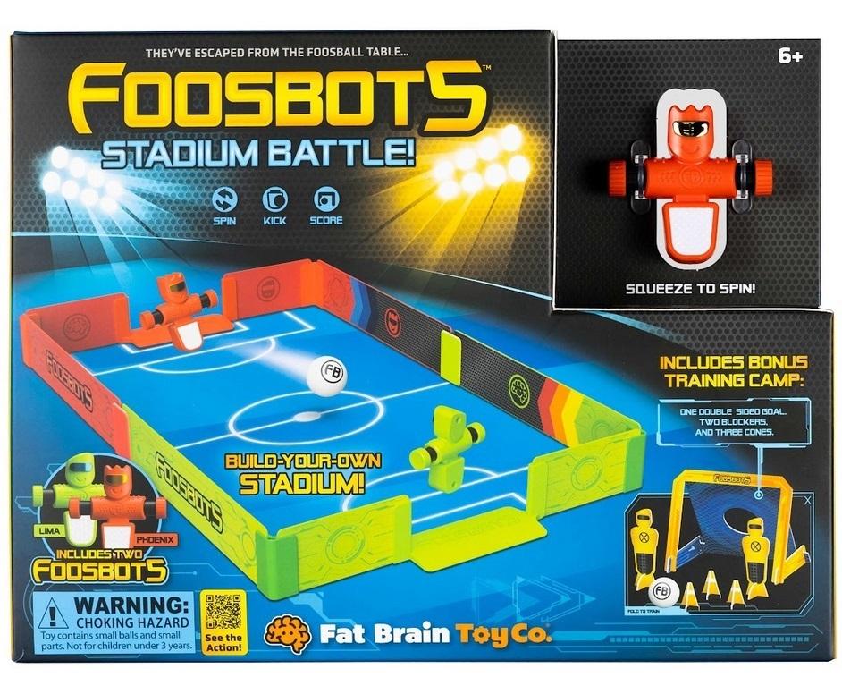 Zestaw Piłkarzyki Foosbots Stadion Piłkarski zawiera: dwa piłkarzyki, dwie piłki, składany stadion, sprzęt treningowy, monetę do rzucania.