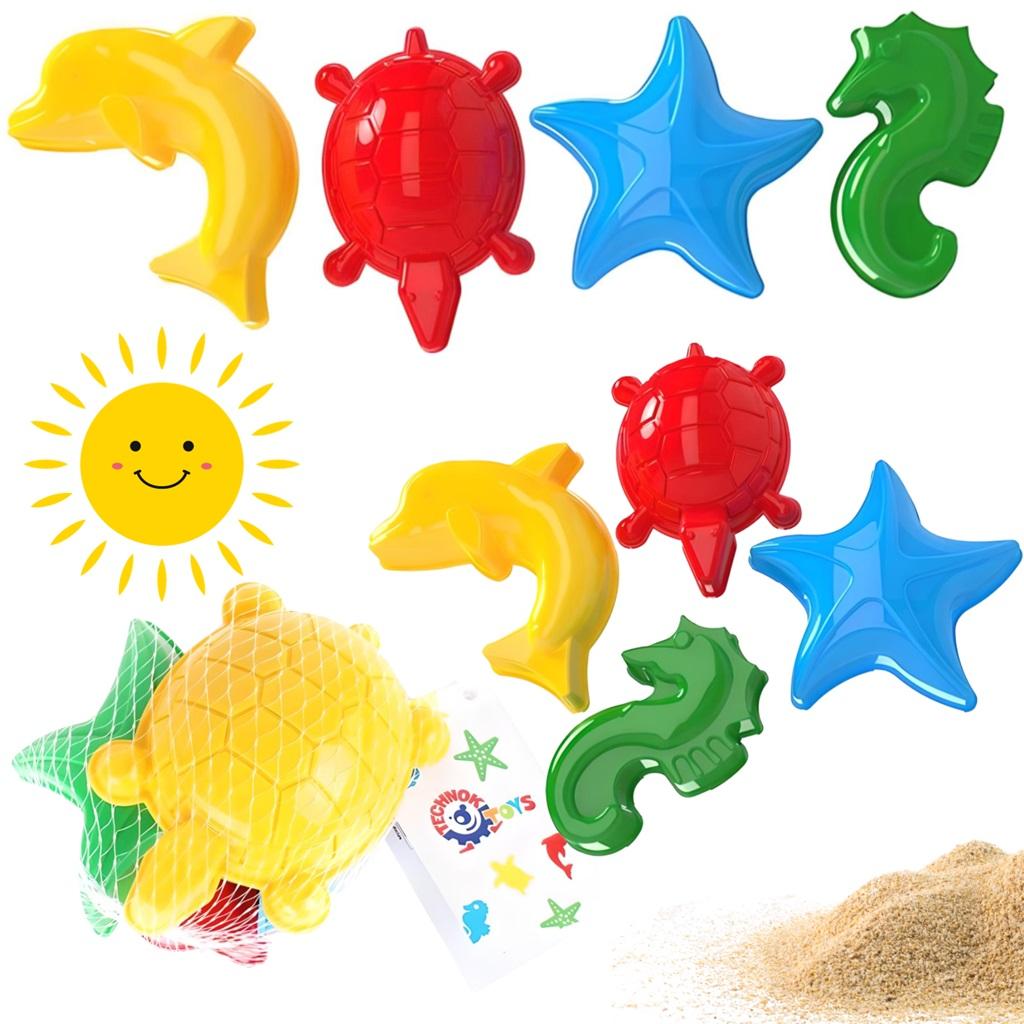 W skład zestawu wchodzą cztery różne foremki, przedstawiające popularne zwierzęta morskie: delfinka, konika morskiego, gwiazdę oraz żółwika. Każda z foremek zachwyca nie tylko kształtem, ale także pięknymi, różnorodnymi kolorami, co dodatkowo rozbudzi wyobraźnię i zmysły dziecka.
