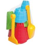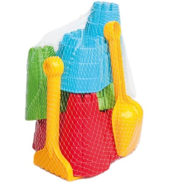 Komplet zawiera: 3 foremki w kształcie zamku, grabki oraz łopatkę. Mix kolorów, towar wysyłany losowo!
