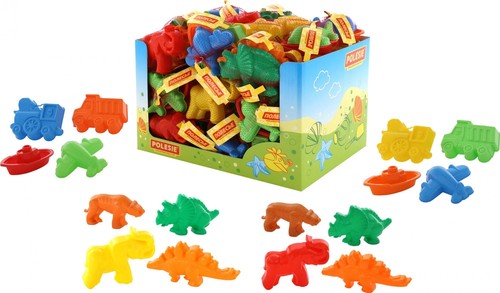 Zestaw czterech foremek do piasku, zapakowane w siatce. Mix zestawów, wybierany losowo. Wiek 1+