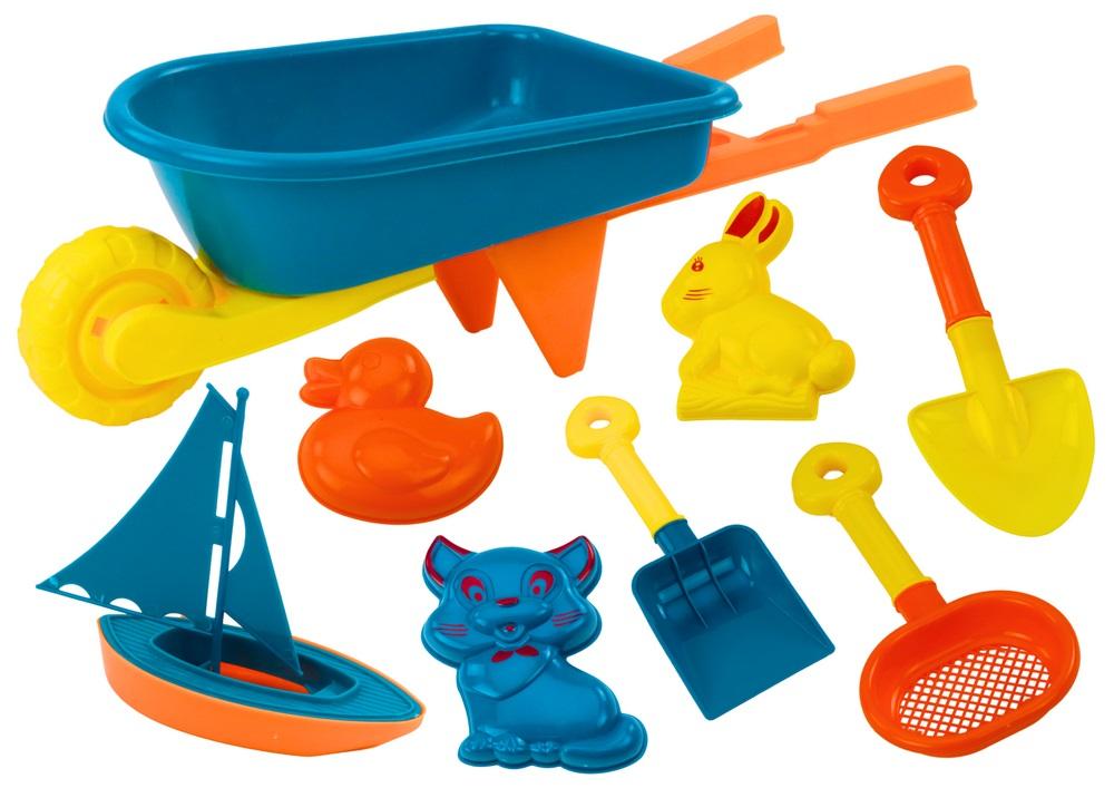 Zestaw Zabawek Do Piasku Toczka Foremki Zwierzątka Łódka Turkusowy Zestaw zabawek do piasku w kolorach turkusowym, żółtym i pomarańczowym jest kompletnym narzędziem do kreatywnej zabawy na plaży lub w piaskownicy. Głównym elementem zestawu jest wielofunkcyjna toczka, która nie tylko służy do transportowania piasku, ale także może pełnić rolę lejka do przesypywania wody. W zestawie znajdują się także trzy foremki w kształcie uroczych zwierzątek, które zachęcają dzieci do tworzenia piaskowych menażerii. Dwie łopatki są nieocenione podczas kopania i tworzenia budowli. Turkusowa łopatka ma szersze ostrze, co jest idealne do przenoszenia większych ilości piasku, natomiast żółta jest bardziej szpiczasta, co ułatwia kopanie i precyzyjne prace. Sitko dodatkowo urozmaica zabawę, umożliwiając przesiewanie piasku i separowanie drobnych elementów. Dodatkową atrakcją jest mała łódka, która zapewnia możliwość zabawy w wodzie, dodając zestawowi dodatkowej funkcjonalności i zapewniając dzieciom możliwość eksploracji na różne sposoby. Zestaw wykonany jest z wysokiej jakości, bezpiecznych dla dzieci materiałów, co zapewnia długotrwałą i bezpieczną zabawę. Jest to idealny sposób na rozwijanie wyobraźni, kreatywności oraz zdolności manualnych dziecka podczas letnich przygód na świeżym powietrzu. Wymiary toczki: 42cm x 18,5cm x 11,5cm Wymiary łopatki turkusowej: 23,5cm x 8,5cm Wymiary łopatki żółtej: 23,5cm x 8cm Wymiary sitka: 21cm x 10,5cm Wymiary łódki: 11cm x 10cm x 4,5cm Posiada certyfikat CE, ponadto jest zgodny z normą EN71. Przeznaczony dla dzieci powyżej 3 roku życia.