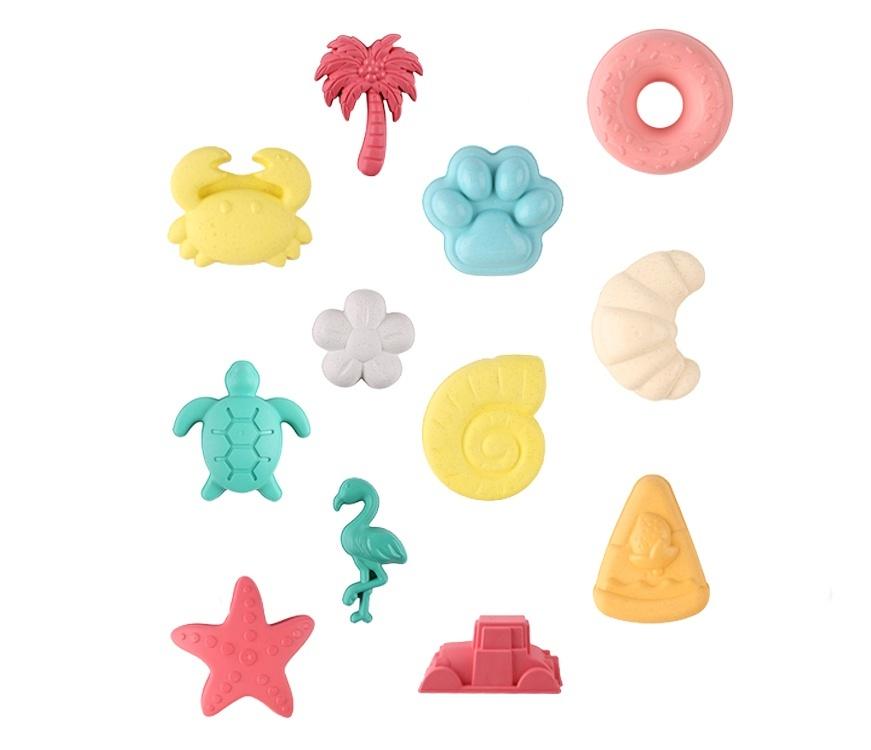 W zestawie: 12 foremek w kształtach: kraba, palmy, łapy, pączka, żółwia morskiego, kwiatka, muszli ślimaka, rogala, gwiazdy, flaminga, pojazdu budowlanego, kawałka pizzy; pakowane w siatkę; 3