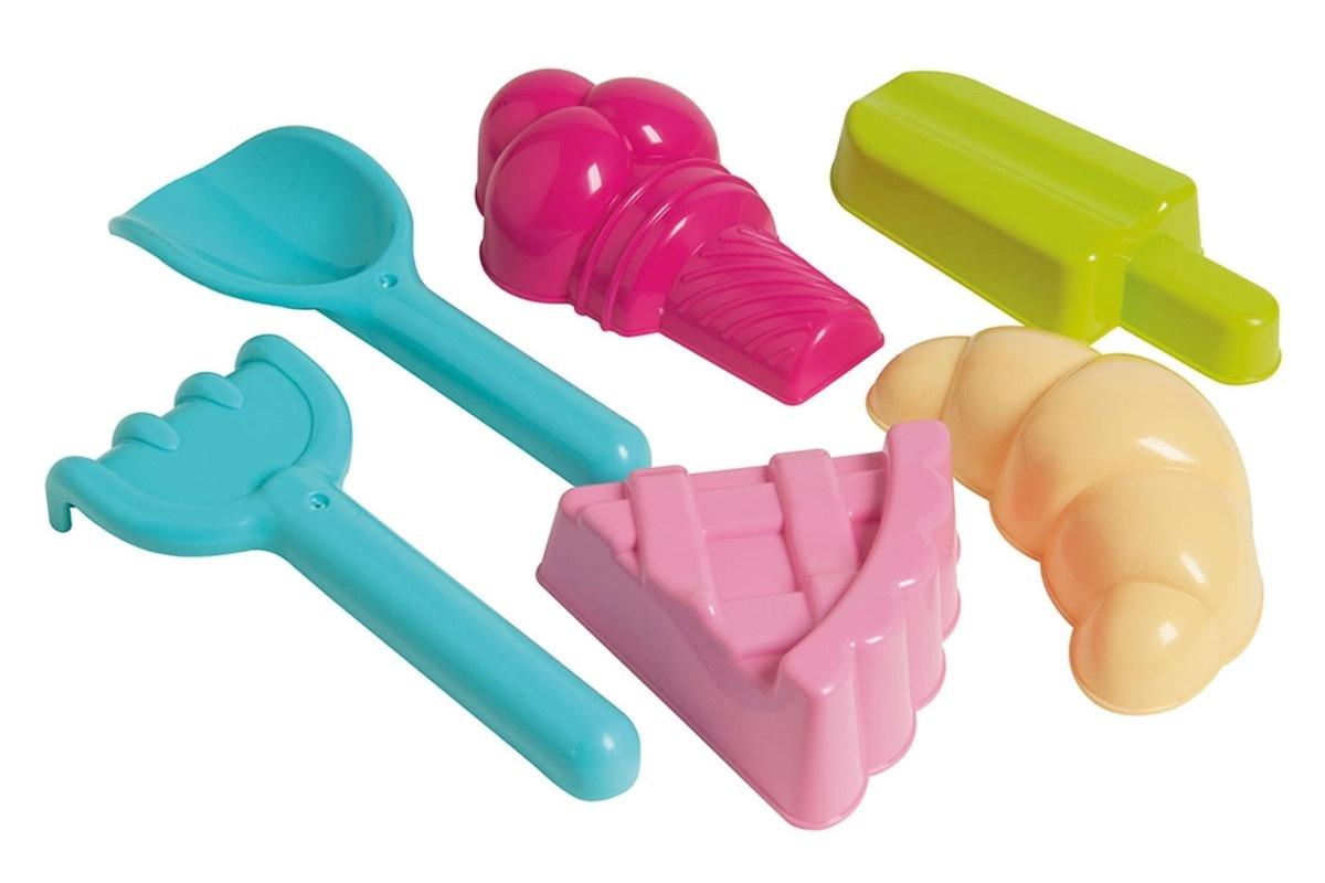 6 elementów w zestawie: lody w wafelku, lody na patyku, rogalik, kawałek ciasta, łopatka, grabki