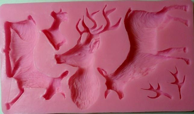 Forma silikonowa wielkości 11 cm x 19 cm (duża, ciężka forma grubości 14 mm )do odlewów z gipsu, mas plastycznych, plasteliny, modeliny, mas cukierniczych itp.Z formy jest możliwość odlania lub stworzenia 6 elementów w kształcie jeleni, łań i poroża.