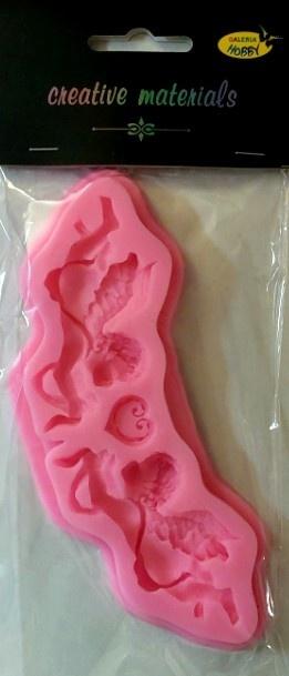 Forma silikonowa wielkości 15,5 cm x 6,5 cm do odlewów z gipsu, mas plastycznych, plasteliny, modeliny, mas cukierniczych itp.Z formy jest możliwość odlania lub stworzenia 3 Elementów - 2 w kształcie aniołka ( cherubinka ) i jednego w kształcie serca z ornamentem.