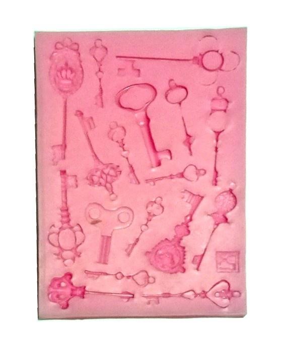 Forma silikonowa wielkości 12 cm x 8,5 cm do odlewów z gipsu, mas plastycznych, plasteliny, modeliny, mas cukierniczych itp.Z formy jest możliwość odlania lub stworzenia 16 elementów w kształcie kluczy.